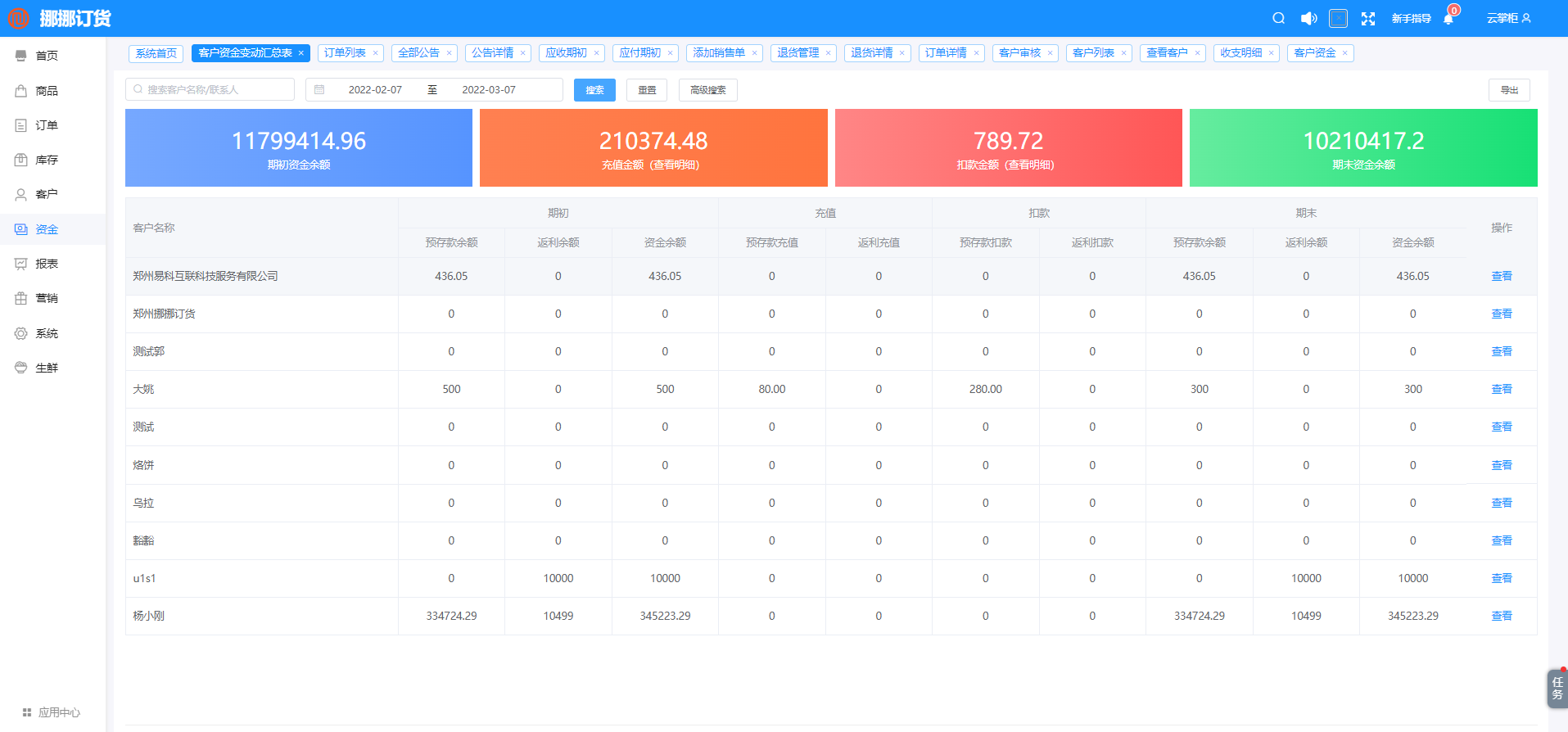 表格顯示:客戶名稱、期初、充值、扣款、期末客戶資金變動(dòng)后的余額顯示,并可導(dǎo)出excel